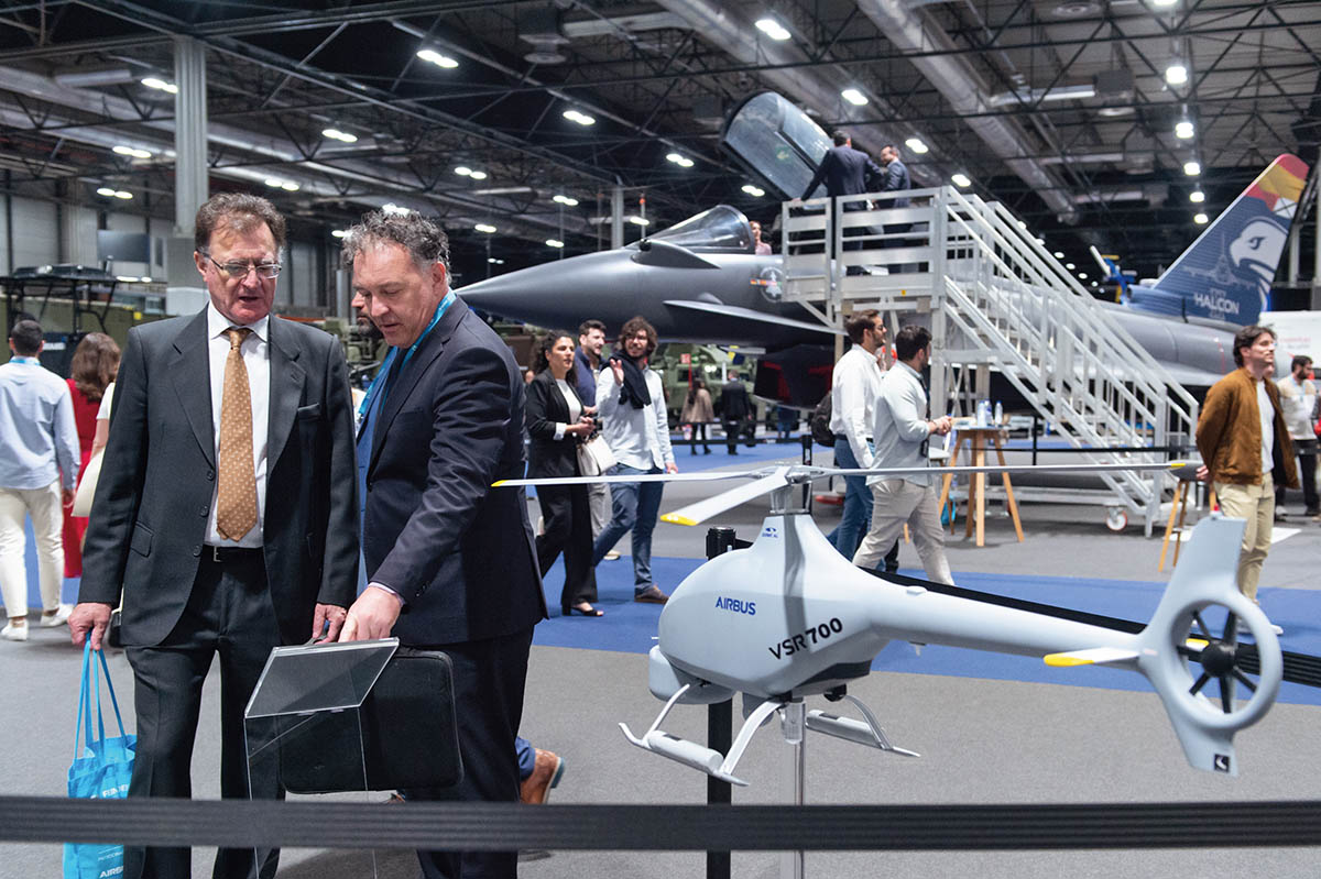 5月13日,在西班牙马德里举行的西班牙国际防务与安全博览会上,与会者观摩无人机产品
