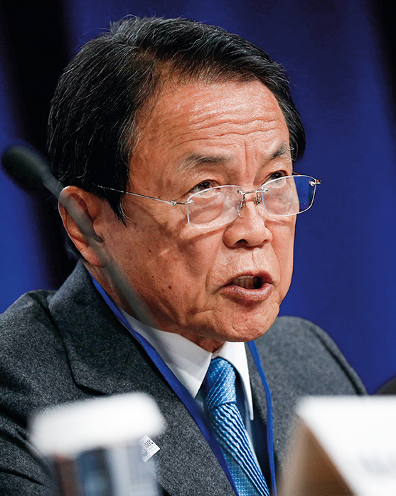 2019 年 4 月 12 日,在美国华盛顿,当时的日本副首相兼财务大臣麻生太郎在新闻发布会上发言