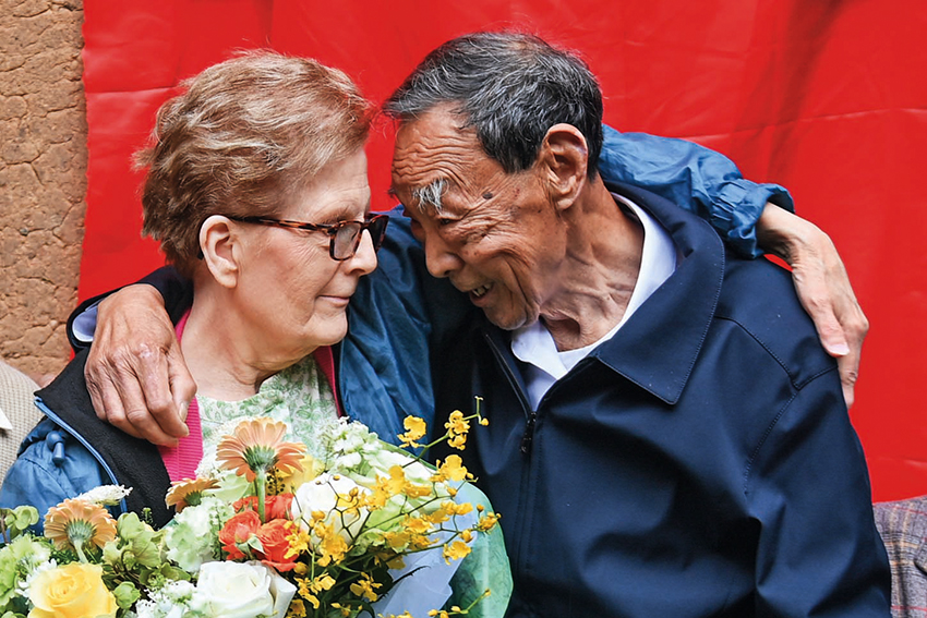 2024年4 月17日,在浙江衢州江山市张村乡龙头店村,“杜立特行动”3 号机领航员查尔斯·奥祖克的女儿苏珊·奥祖克(左)与村民廖明发相拥