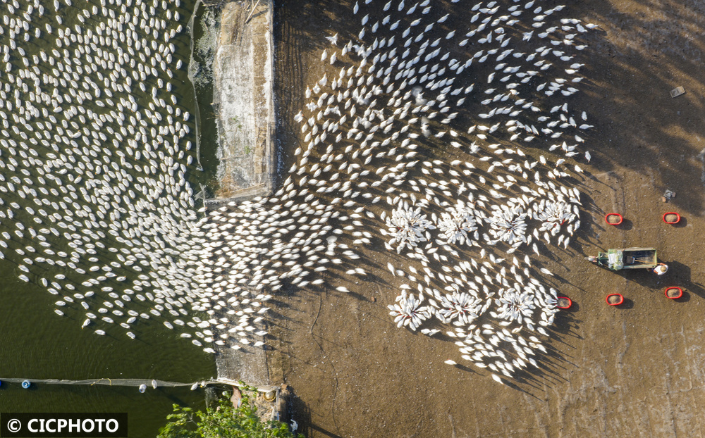 2025年7月12日,江苏省宿迁市泗洪县石集乡一生态鹅养殖基地生机盎然,工作人员正忙着投放饲料。近年来,石集乡依托滩涂等自然资源大力发展生态养殖,既盘活了闲置资源,又通过规模化养殖带动农户增收。