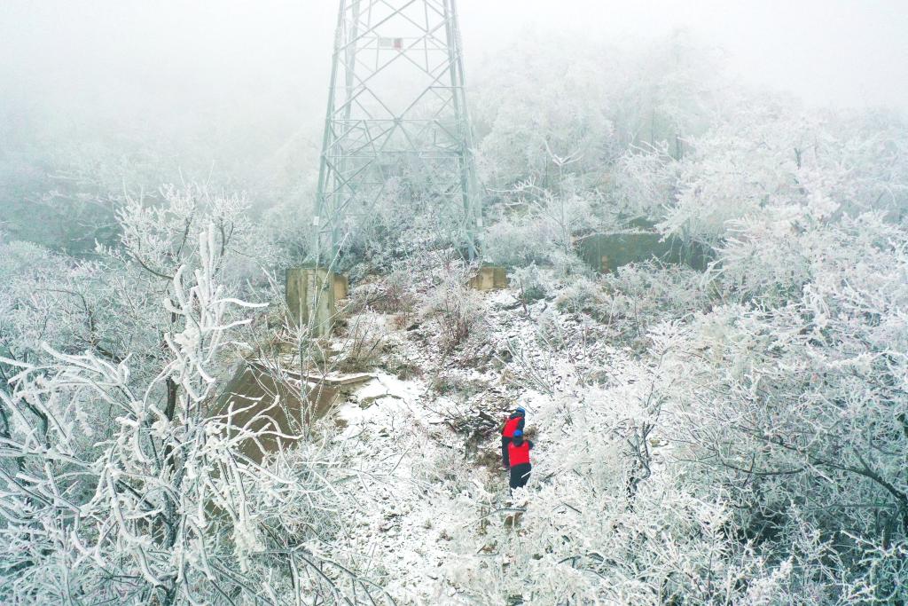 1月20日,国网随县供电公司运检人员在风雪中开展特巡。(吴绪章 摄)
