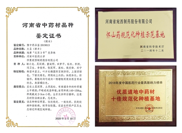 仲景宛西制藥是國內首家提出“藥材好,藥才好”理念的企業,有自建的中藥材種植基地,藥材地道,藥源清晰。是最早一批通過中藥材生產管理規范(GAP)認證的企業之一,得到了政府部門、行業協會等社會各界廣泛認可。其中懷山藥、懷地黃基地被授予“河南省規范化種植示范基地”、山茱萸基地“中國優質地道中藥材十佳規范化種植基地”。