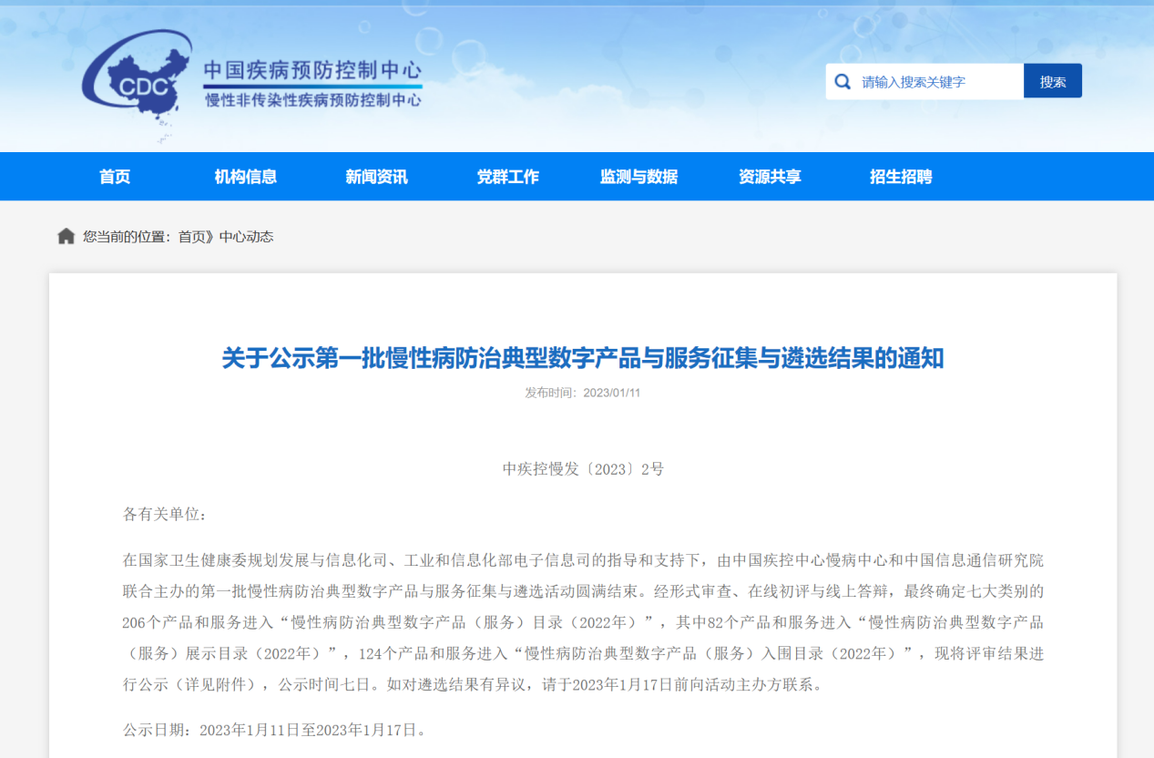 据了解,通过遴选评审的典型产品和服务将在中国疾控中心慢病中心和中国信通院官方网站上进行公示,并编入《慢性病防治典型数字产品与服务目录》(2022年),在重要慢性病行业会议上发布,并推荐在全国慢性病综合防控示范区应用推广。