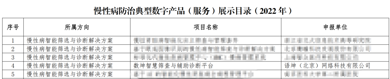 近日,在国家卫生健康委规划发展与信息化司、工业和信息化部电子信息司的指导和支持下,由中国疾控中心慢病中心和中国信息通信研究院联合主办的首批慢性病防治典型数字产品与服务征集和遴选活动公布了入选名单。数坤智慧筛查和辅助诊断平台作为优秀项目,荣誉入选“慢性病防治典型数字产品(服务)展示目录(2022 年)”。