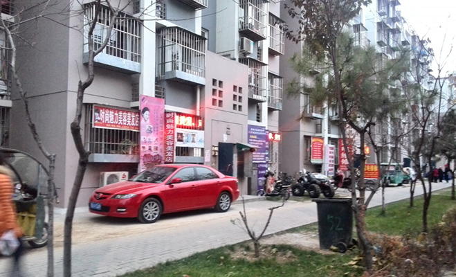 小區(qū)大門附近的樓棟放置了許多房屋租賃、美容、培訓(xùn)等方面的廣告牌,小區(qū)內(nèi)部也可見到居民開設(shè)的超市,顯示小區(qū)對內(nèi)部的商業(yè)經(jīng)營管制非常松懈。