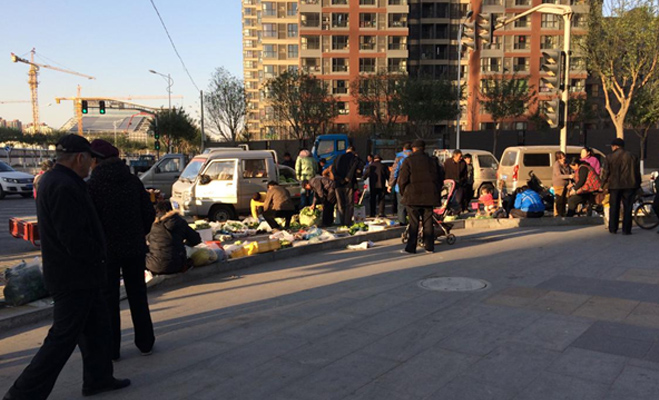 記者看到,剛過16點,附近居民就開始自發在長陽國際城北門的馬路上擺起了蔬菜瓜果攤,這里剛好又連接十字路口,適逢傍晚放學與下班高峰——北京小學長陽分校與長陽國際城僅一路之隔,路面來往的人流車輛驟然增多,停留在此買菜的居民與路面行駛的車流構成了相當程度的安全風險和交通隱患。