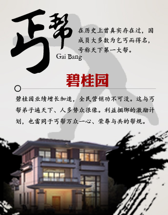 碧桂園 丐幫 丐幫因成員大多數為乞丐而得名,號稱天下第一大幫。 碧桂園是今年房企風頭最勁的一匹黑馬。和丐幫人多勢眾一樣,全民營銷,其躋身千億軍團的最大功臣。
