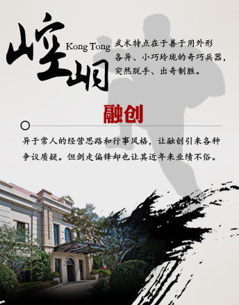 融創 崆峒派 崆峒武術特點在于奇兵,外形各異、攜帶方便, 往往暗藏于袖筒和靴筒中,交手中往往突然出擊取勝。今年頻頻拿地,其異于常人的經營思路,讓孫宏斌招致各種爭議和質疑。