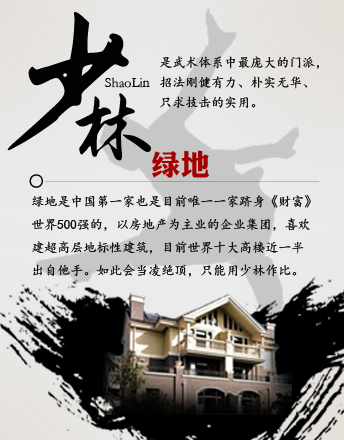 綠地 少林派 少林是體系最龐大的門派,招法剛健有力、攻防兼備、樸實無華。 綠地是中國首家躋身《財富》世界500強的,以房產為主業的企業。項目遍及全國,世界十大高樓近一半來自綠地。