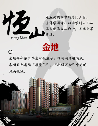 金地 恒山派 原是五岳劍派中的名門正派,有佛學淵源。后差點全軍覆沒。 金地過去為業界四大天王之一。但其今年第三季度財報顯示:凈利潤降逾兩成,各項目屢陷質量門,天王冠冕也不保。