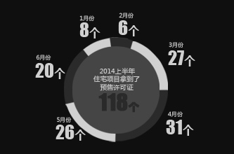 2014年上半年,共有118個住宅項目拿到了預售許可證。批準銷售總套數為38363套,已銷售套數為11146套。其整體月均去化率為13.64%。