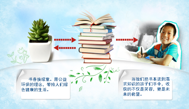 | 在新華房產“圖書換綠植”大型系列公益活動中,我們提倡用手邊的兩三本舊書,來換取一株綠色的小植物。我們會將這些書本送到貧困山區孩子們的手中,給予他們最渴求的知識;我們也會給你的辦公桌前,留下一抹綠意,讓你在工作閑暇之余,放松心神。 |