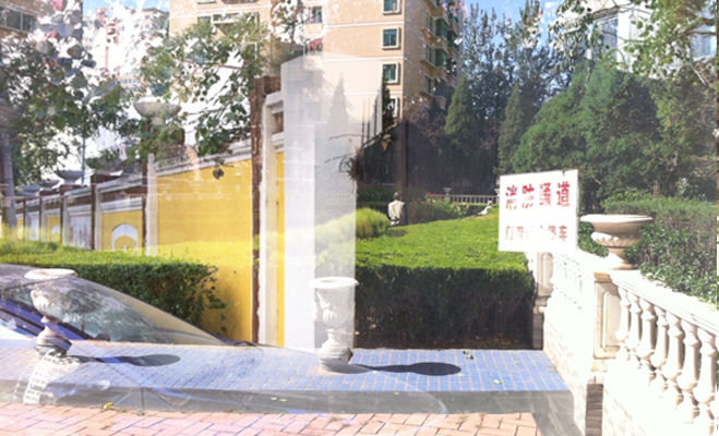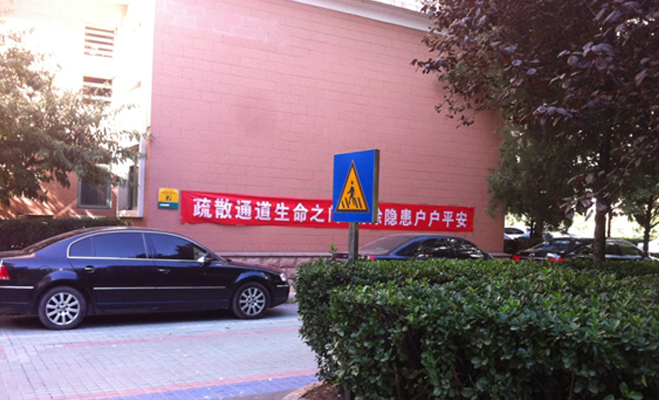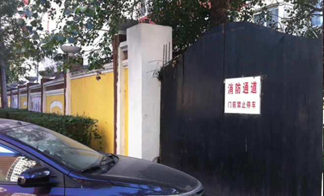 記者跟隨業(yè)主從東門進(jìn)入小區(qū),迎面看到掛有疏散通道的條幅,但疏散通道似乎被車輛占據(jù)。而小區(qū)外面的消防通道門前也寫明了不許停車,但此警告語并沒有用處,門前依舊停有車輛。小區(qū)東門有保安,業(yè)主需刷卡進(jìn)入,小區(qū)北門有車輛的門禁,但沒有設(shè)業(yè)主門禁,這與中海其他盤嚴(yán)密的門禁制度不符。