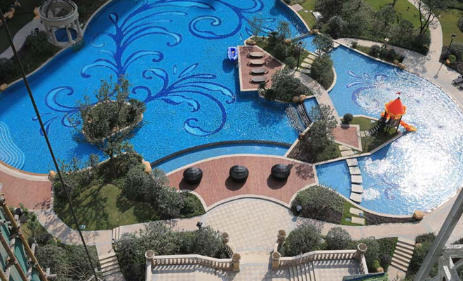 據資料顯示,大名城綠化率為41.5%,樓間距為160米,小區內部區規劃擁有中央疊瀑和中央泳池。目前,大名城東區1400㎡無邊界游泳池已經開放使用。記者實地走訪泳池周邊發現,一名工作人員正在清理池內雜物,該工作人員告訴記者,大名城工作人員會定時清理泳池及周邊景觀區域,保證小區內部時刻干凈整潔。縱觀東區整體景觀,池水清澈,周邊花卉植物、雕像噴泉錯落有致,景觀整體格調高端。