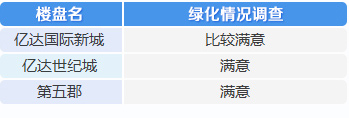 根據(jù)上表可以看出:調(diào)查問卷中的三個項目,居民對小區(qū)綠化都表示滿意,記者在走訪調(diào)查中發(fā)現(xiàn),億達(dá)多個小區(qū)整體環(huán)境干凈、整齊,規(guī)劃很合理,以普通住宅區(qū)的標(biāo)準(zhǔn)來衡量,其綠化率、植物種類等算是超過同類標(biāo)準(zhǔn)。