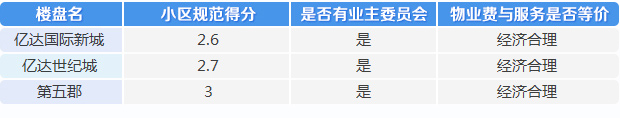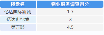 在物業(yè)服務(wù)調(diào)查過程中,第五郡分?jǐn)?shù)最高為4.5分,億達(dá)國際新城得分最低,為1.7分。