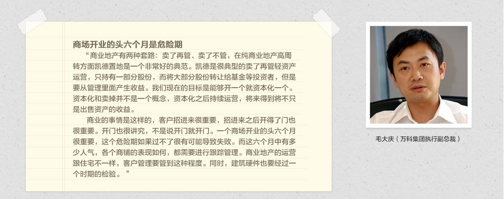 商業地產開發模式漸近成熟,城市綜合體或將成為開發主流。萬達集團董事長王健林作了個形象的比喻:住宅地產是小學生;做商務地產、寫字樓、度假村等是中學生;做商業地產是大學生;做城市綜合體是研究生…[詳細] |