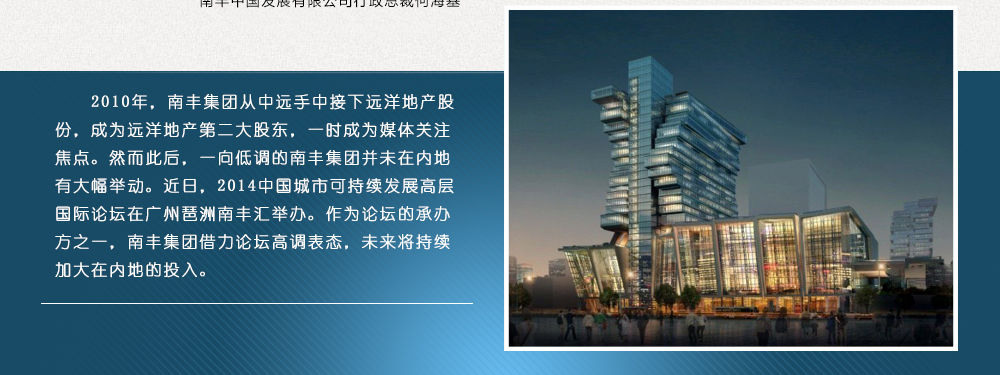 已在內地三亞、北京、大連等地有多個項目的南豐中國是南豐集團最接內地“地氣”的公司,也更為熟悉內地市場與政策。何?;J為當下中國城市可持續發展的趨勢使企業必須在做項目之前就考慮到幾年后買房及用辦公樓的人們對低碳、智慧等需求。【詳情】