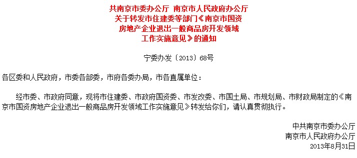 中國共產黨南京市委員會官方網站在2013年9月3日傍晚7點多發布關于轉發市住建委等部門《南京市國資房地產企業退出一般商品房開發領域工作實施意見》的通知。通知中明確了市屬全資及控股房地產企業基本情況、市屬參股房地產企業基本情況。 …[詳細]