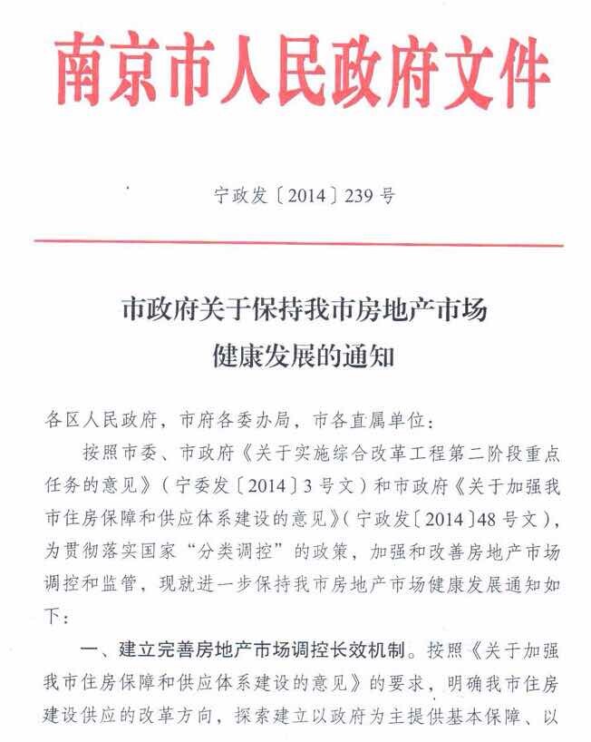 9月21日下午,南京市政府正式發(fā)文,明確全面取消住房限購,即日起購房不再需提供新購住房證明,持續(xù)三年零9個月的南京樓市“限購令”宣告退出歷史舞臺。據(jù)了解,2011年2月,“限購令”正式落地南京,為火熱的樓市澆了一盆冷水。但進入2012年之后,南京樓市逐漸回暖,2013年更是進入全面瘋狂。直至2014年以來,樓市開始疲軟,國家統(tǒng)計局數(shù)據(jù),南京房價6月、7月、8月連續(xù)下跌三個月,9月樓市庫存量更是重回5萬套大關,解除限購的呼聲愈來愈高。據(jù)悉,南京解除限購令之后,全國目前只剩北京、上海、廣州、深圳、珠海、三亞6個城市仍執(zhí)行樓市限購政策。