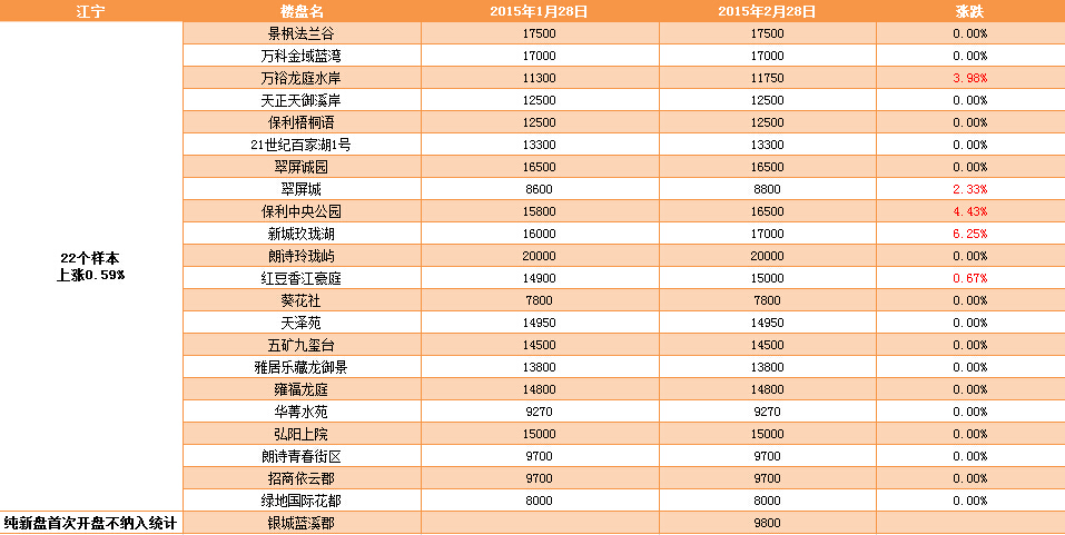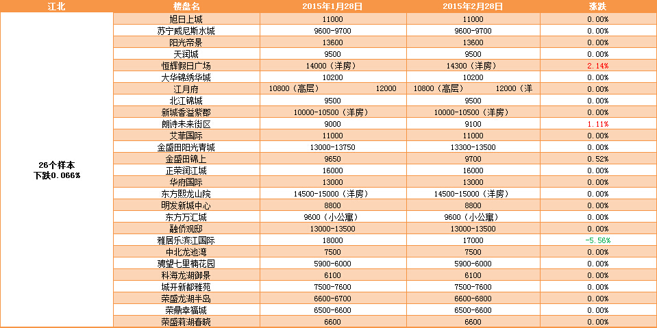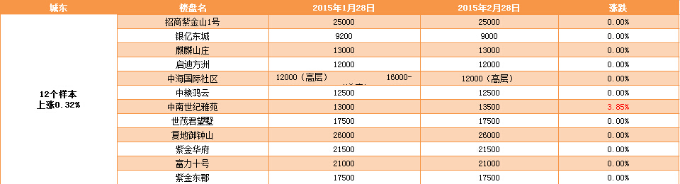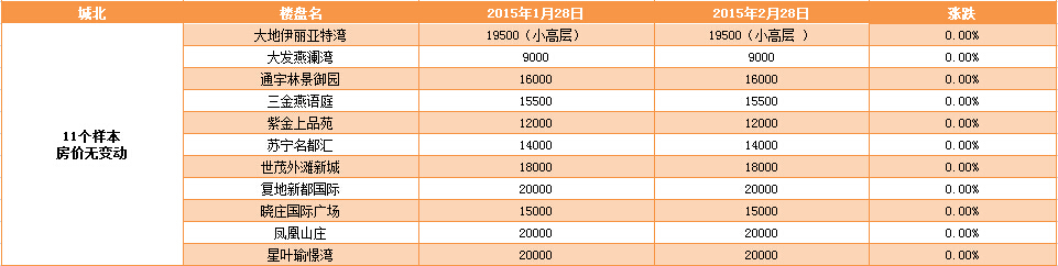 新華房產記者統計發現,2015年2月南京樓市八大板塊中,江寧、河西、城東房價上漲,江北房價下跌,其余板塊房價無變動。 綜合結果,2月房價環比微漲0.12%。 [詳細]