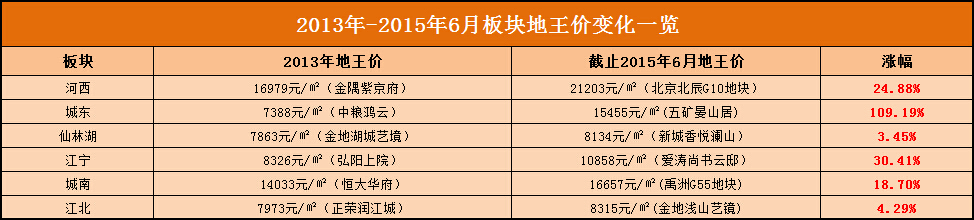 縱觀南京土地市場近幾年來的成交情況,2013年和2014年無疑顯得最為瘋狂。據統計,兩年間,南京土地市場共成交25幅萬元地塊,其中最高樓面價北京金隅16979元/㎡(現金隅紫京府項目)。直到2015年6月11日,北京北辰經過41輪的競拍以總價15億元、樓面價21203元/㎡競得河西中部NO.2015G10地塊后,南京新“地王”價格成功被刷新。 土地價格走高, 勢必帶動所在板塊房價進入一個上行的通道。經新華網江蘇統計,在南京8大主要板塊中,有6大板塊的地王價格在兩年半里出現了明顯上漲。 [詳細]