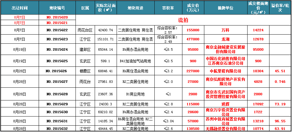 據新華房產統計,2015年8月,南京市(高淳、溧水除外)土地交易市場共計成交11幅地塊,流拍2幅地塊,總出讓面積達536431.4平方米,市國土局共計吸金132.3億元,環比7月26.7億元的出讓金總額翻了將近4倍。 [詳細]