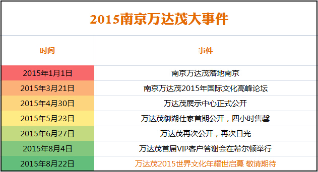 2015世界文化年當天,將有俄羅斯、埃及、巴西等眾多國際的使節,聯合國開發計劃署項目官等世界名流,大家歡聚一堂,除了見證這一盛世活動的啟幕,更將一起規劃出南京萬達茂國際街,南京最長的一個主題步行商業街的未來發展,打造出一個原汁原味的世界風情街。
