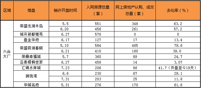 根據網上房地產的統計數據顯示,六合片區內樓盤的實際銷量呈現出了兩極分化狀,當地“龍頭”企業榮盛旗下各盤依舊不愁賣,但除此之外,約計八成情況不容樂觀,超過一個月的累計去化率不足四成。更有一盤,6月底領到的預售房源,至今無一套房源進賬。