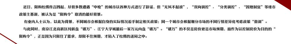 誠如標題所述,“破萬”的不僅是房價更是市場預期,而作為以控制房價為目的的“限購令”,正是因為只限住了需求,卻限不住預期,才陷入了松綁的迷局之中。 就以江北六合為例,“破萬”的預期從今年年初便已開始,重要的依據是2013年的熱銷局面。據了解,去年全年六合區域商品房銷量突破了1.1萬套,創歷史新高。 即便是今年一季度,每個月的銷量也持續保持在南京前三的位置,僅次于江寧、浦口。 “這已經帶來了一種需求量旺盛的預期。”世聯行高級研究員董曄分析指出,需求旺盛給供應帶來了動力,持續的動力又給房價上漲提供了動力,“這是‘限購令’無法限制的。”…【詳細