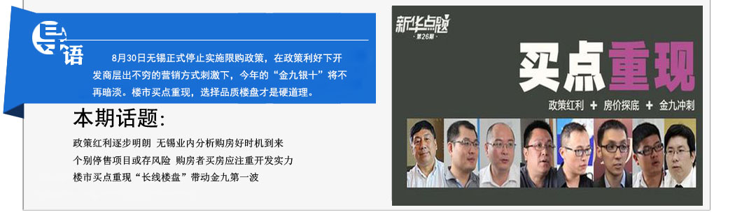 無錫市正式停止執行限購政策。8月最后一個周末無錫商品住宅成交446套,環比上漲58.7%。雖然沒有全面復蘇的跡象,但是在政策利好,開發商層出不窮的營銷方式刺激下,今年“金九銀十”不再暗淡,成為樓市發展的新起點。