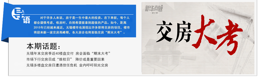 對于許多人來說,房子是一生中最大的投資。在下單前,每個人都會謹慎考慮,收房時,自然希望能拿到超值的產品。如今,距離2015年已經越來越近,無錫樓市也涌現出許多即將交房的項目,樓市將迎來新一波交房高峰期,各大房企也將面臨交房“期末大考”。