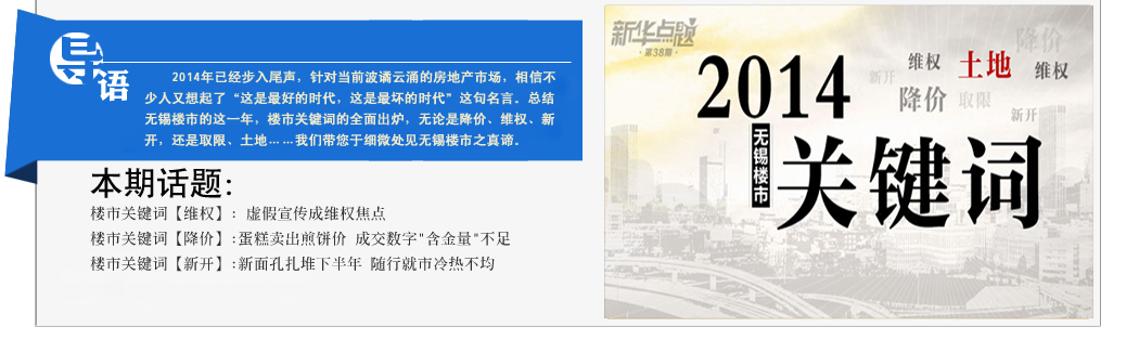 2014年進入尾聲,這一年無錫的房地產市場頗不平靜,降價聲、維權聲、政策放寬聲“聲聲不息”。特此,新華房產進行《2014無錫樓市關鍵詞》系列報道,梳理2014全年無錫樓市的發展狀況。