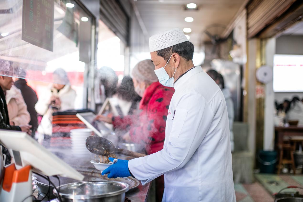 在漯河市北舞渡镇胡辣汤店,工作人员在为食客盛胡辣汤。新华社 发