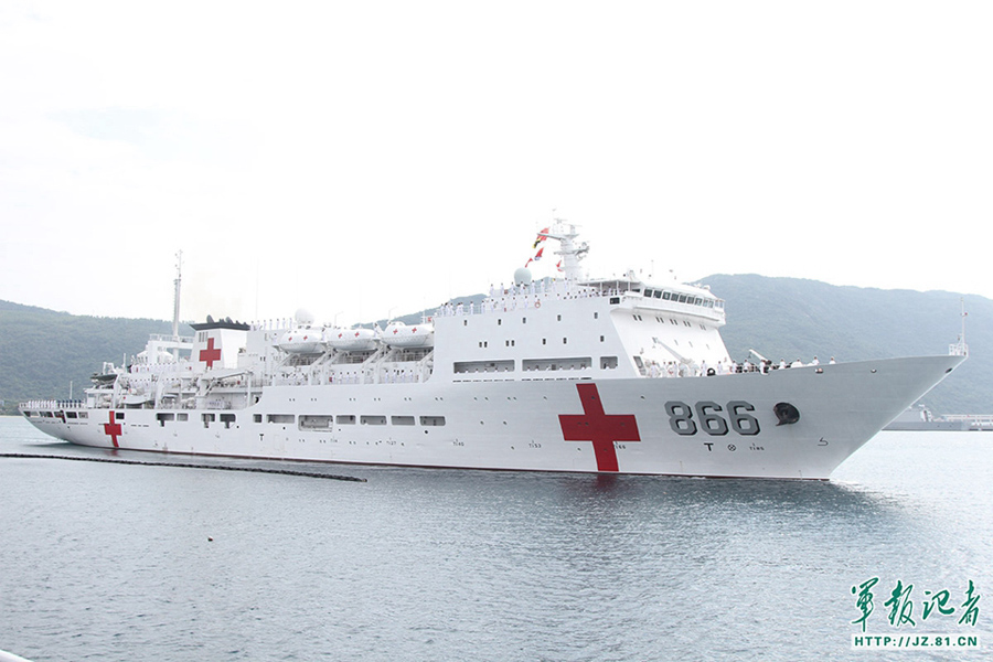??? The Chinese sailors man the rails aboard the hospital ship Peace Ark as the ship leaves a military port in Sanya in south China's Hainan Province on September 12, 2015. A Chinese naval taskforce, composed of the guided-missile destroyer Lanzhou, the guide-missile frigate Yueyang and the hospital ship Peace Ark, left a military port in Sanya in south China's Hainan Province on September 12 for a military exercise jointly held by China and Malaysia. The joint military exercise, codenamed "Peace and Friendship 2015," is scheduled to be held from September 17 to 22 in the Malacca Strait and its adjacent area.
