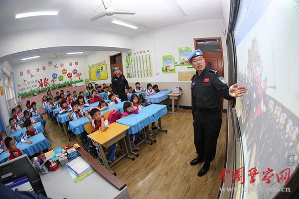 維和警察亓恒剛為青島市樺川路小學的師生們講述在利比里亞的執勤任務。