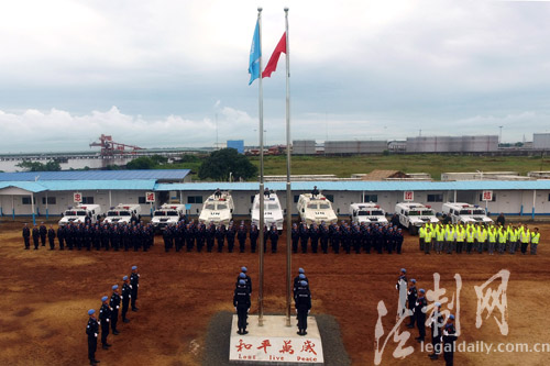 ????利比里亞蒙羅維亞時間9月25日,中國第四支駐利比里亞維和警察防暴隊與駐利比里亞中資企業(yè)員工和華人華僑代表一同舉行“戰(zhàn)地國旗別樣紅”慶祝國慶活動,在中華人民共和國成立67周年來臨之際,在距離祖國一萬三千公里的維和任務區(qū)向祖國致敬。