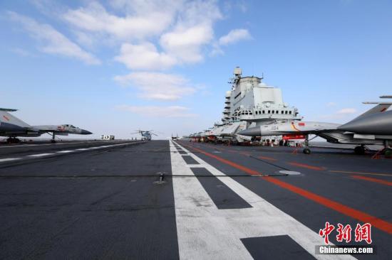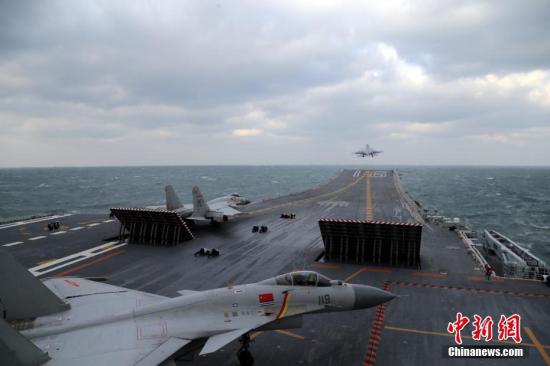 資料圖:2016年12月23日,在黃海某??沼颍嗯螝?15艦載戰斗機從遼寧艦飛行甲板起飛升空,開展了空中加受油、空中對抗等多項訓練任務。 中新社發 莫小亮 攝