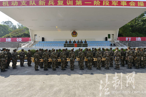 ????新兵個個立起軍人好樣子,士氣高昂,勇爭第一,以優秀的表現完成了新兵第一階段的復訓考核:隊列、擒敵拳、警棍盾牌操,整齊威嚴,殺氣沖天;單雙杠一練習、5000米、射擊,讓人眼前一亮,優秀率過半。