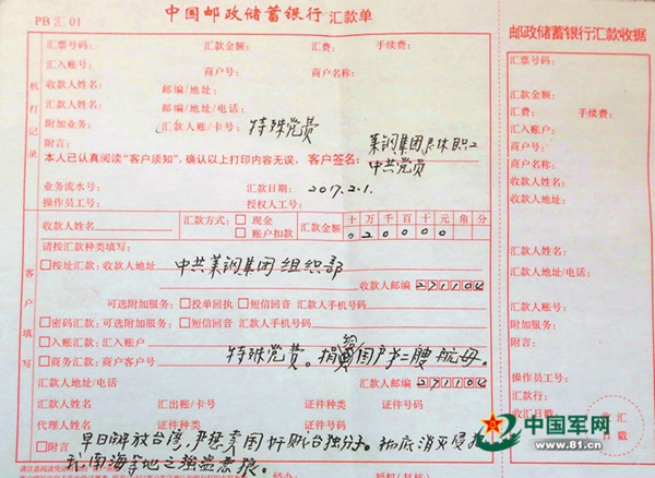 2月6日,山東省鋼鐵集團有限公司萊鋼黨委組織部接到一張匯款單,金額為兩萬元整,簽名為“中共黨員、萊鋼集團退休職工”,附言:“特殊黨費,捐給國產第二艘航母……”