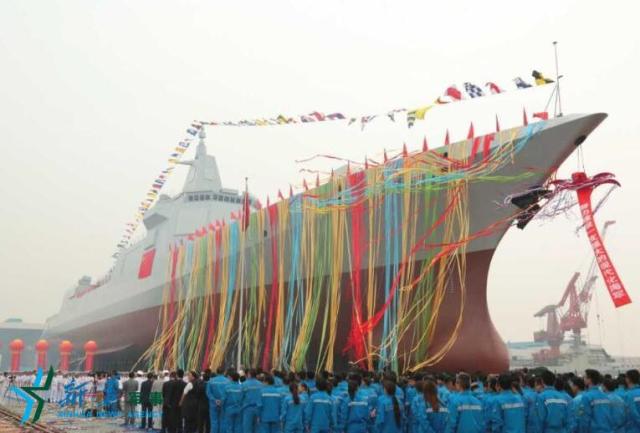 中國海軍新型驅逐艦首艦下水儀式28日上午在上海江南造船(集團)有限責任公司舉行。這型驅逐艦是我國完全自主研制的新型萬噸級驅逐艦,先后突破了大型艦艇總體設計、信息集成、總裝建造等一系列關鍵技術,裝備有新型防空、反導、反艦、反潛武器,具有較強的信息感知、防空反導和對海打擊能力,是海軍實現戰略轉型發展的標志性戰艦。尹航 攝