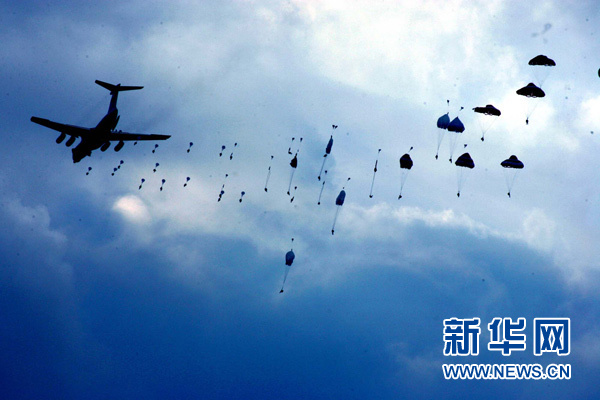 2005年8月24日,參加“和平使命-2005”中俄聯合軍事演習第三階段兩棲登陸作戰實兵課目演練的中國空降兵部隊在實施傘降。新華社記者 查春明 攝