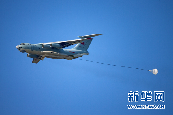 8月4日,中國(guó)空軍伊爾-76戰(zhàn)機(jī)在“航空飛鏢”靶場(chǎng)開放日進(jìn)行重裝空投。新華社發(fā)(楊盼 攝)