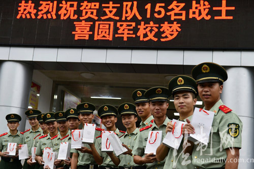????昔日禁毒反恐當(dāng)尖兵,今朝題名金榜站排頭!正當(dāng)各地紛紛樂道高考升學(xué)率的同時(shí),南粵邊防警營(yíng)也傳來喜報(bào)。8月28日,深圳銀湖山訓(xùn)練基地里處處洋溢著喜悅;禁毒尖兵、狙擊手、士官楊平申等來至廣東公安邊防總隊(duì)機(jī)動(dòng)支隊(duì)的15名戰(zhàn)士喜圓軍校夢(mèng),被廊坊武警學(xué)院、公安邊防高等專科學(xué)校等3所部隊(duì)院校錄取,戰(zhàn)友們?yōu)樗麄兣e行簡(jiǎn)樸而隆重的歡送儀式。據(jù)悉,連續(xù)多年來,這個(gè)支隊(duì)在廣東邊防總隊(duì)40多個(gè)基層單位中戰(zhàn)士升學(xué)率名列前茅。