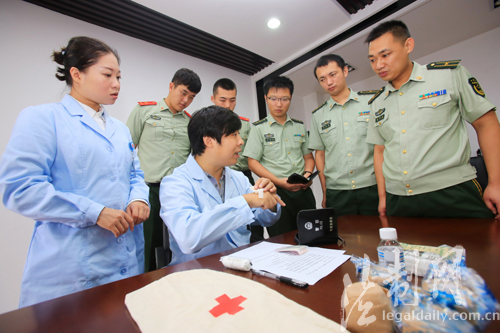圖為醫護人員在邊防派出所為官兵講解警用裝備包中急救物品的使用方法及注意事項