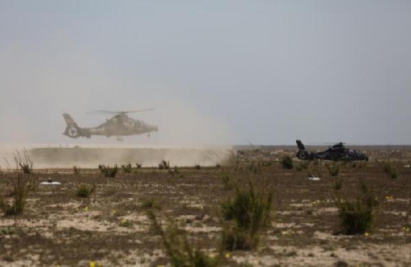 ????武裝直升機在野戰機場帶彈起飛(4月18日攝)。