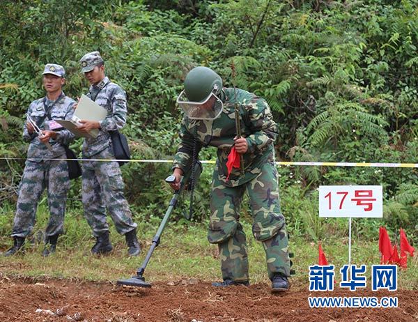 參訓官兵到麻栗坡某綜合訓練場進行探雷器操作使用考核(8月31日攝)。 新華社發(張輝 攝)