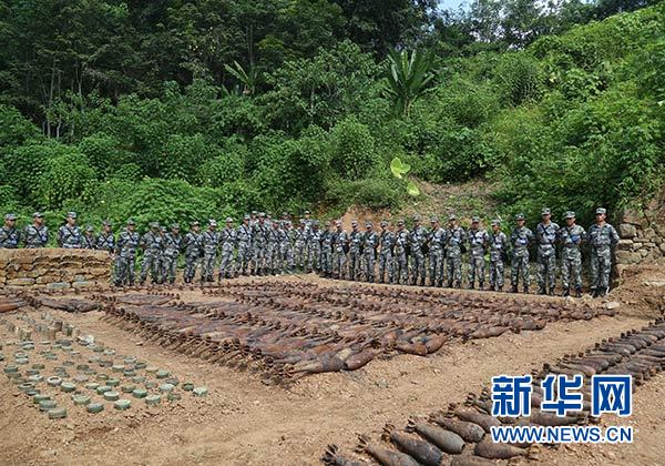 參訓官兵到中越邊境麻栗坡某雷場參觀識別已搜排出的地雷及爆炸物(8月26日攝)。 新華社發(張輝 攝)