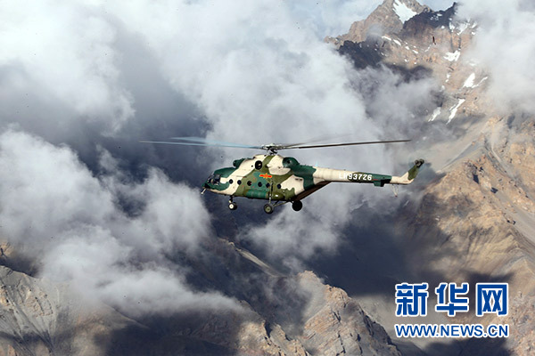 2016年7月20日,新疆軍區某陸航旅運輸直升機一營飛行員在高海拔邊防線執行巡邏任務。新華社發(吳世科 攝)