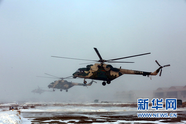 2018年1月5日,新疆軍區某陸航旅運輸直升機一營在嚴寒條件下組織飛行訓練。 新華社發(吳世科 攝)